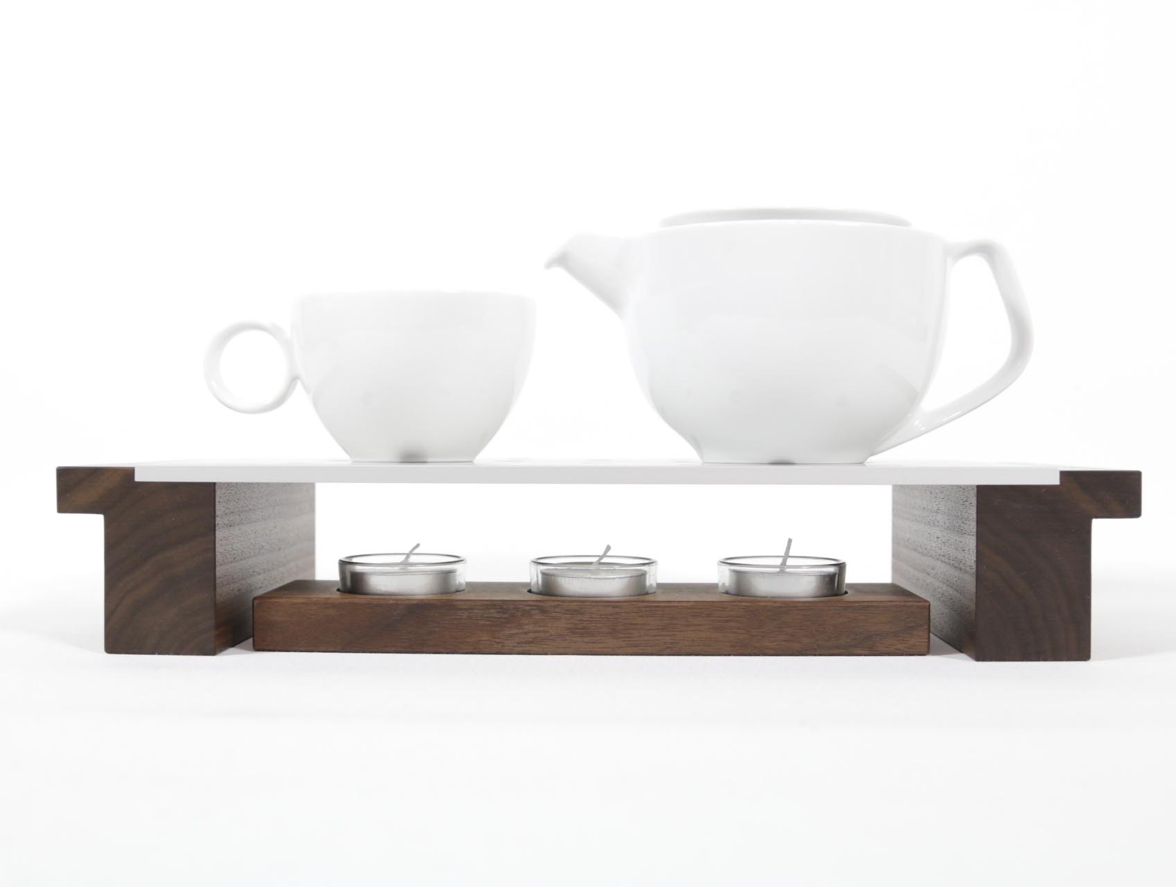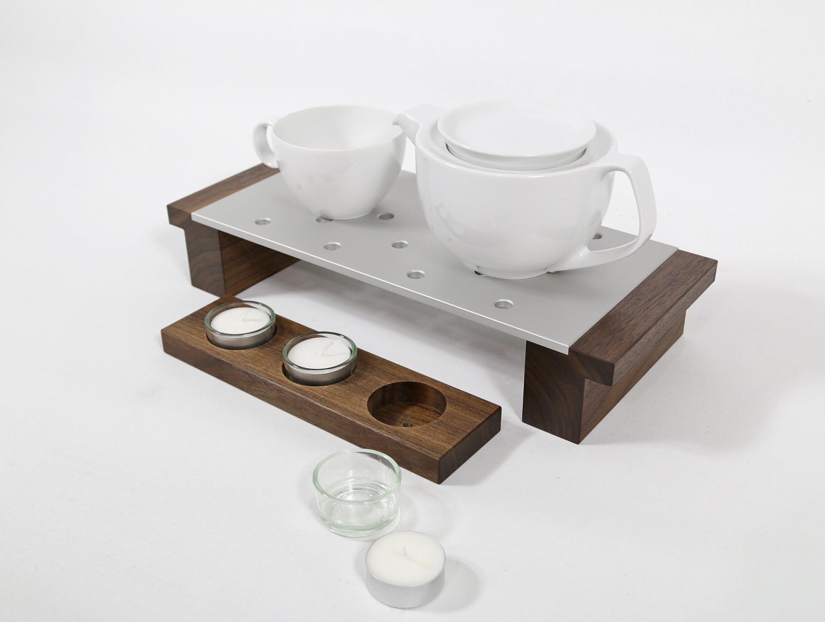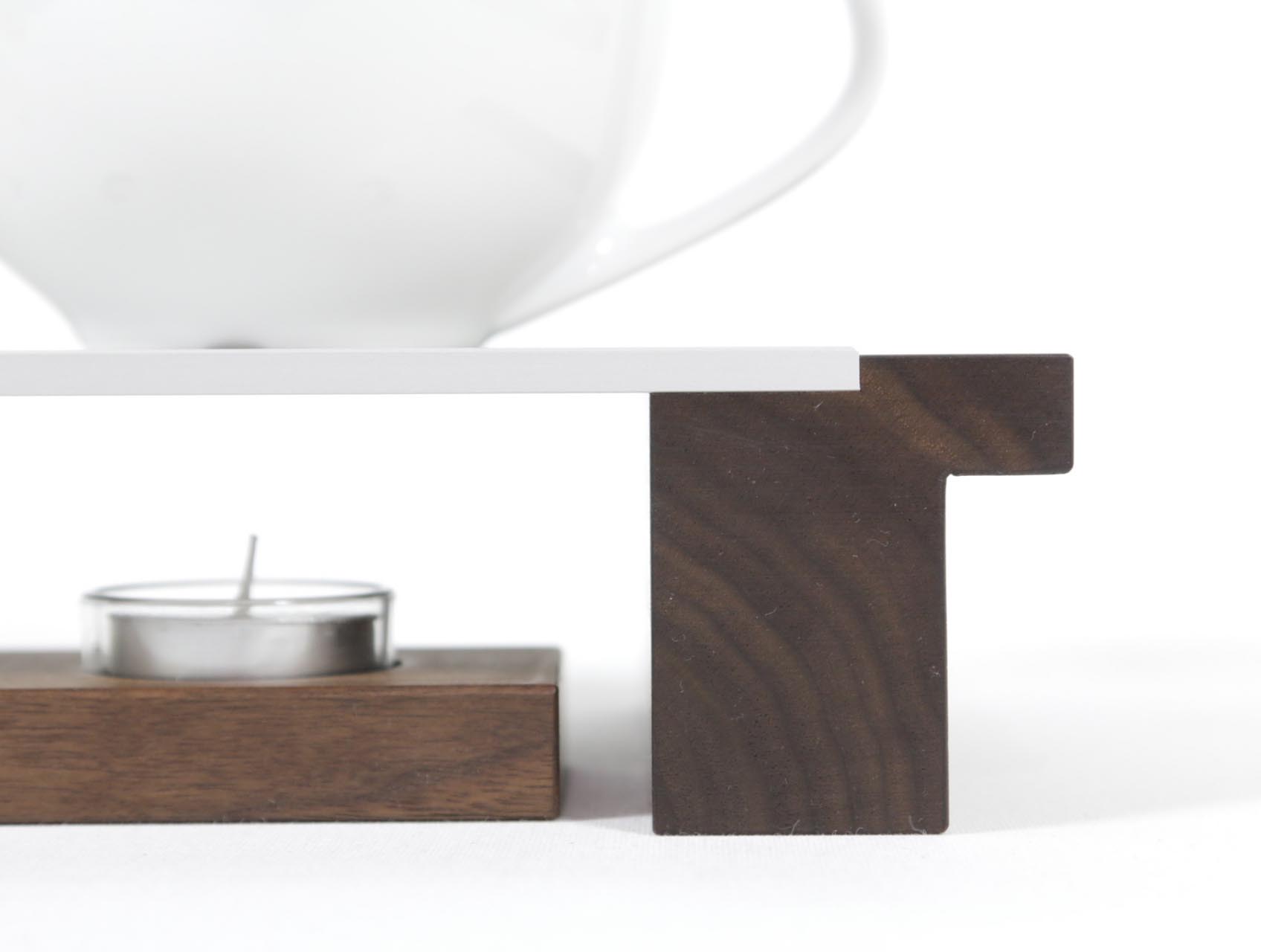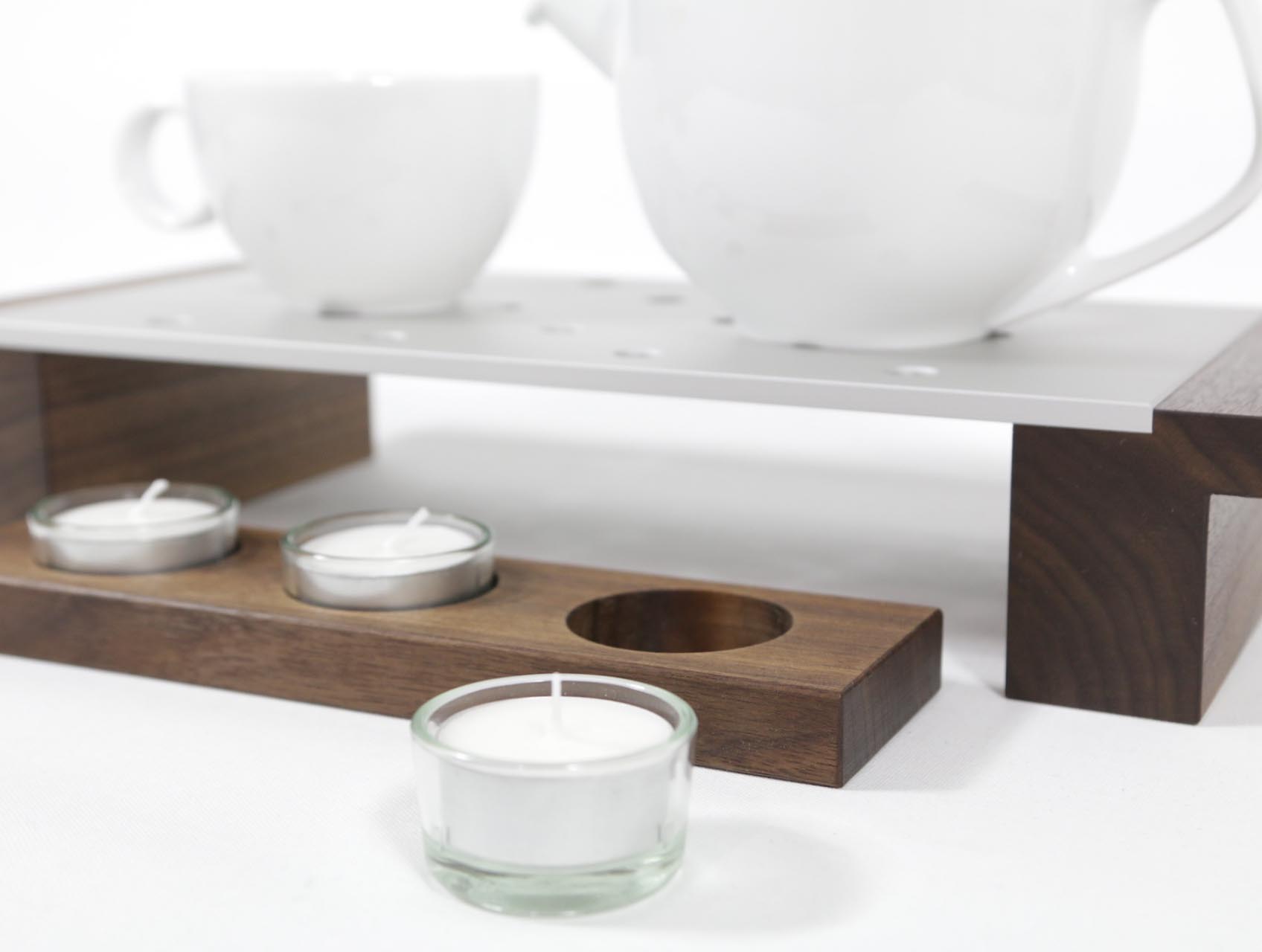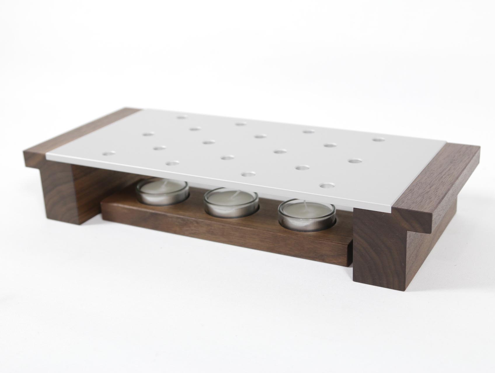 Edles Stövchen aus geöltem, heimischen Schwarznussholz und einer eloxierten Aluminiumplatte. Der Halter für drei Teelichter lässt sich zum Wechseln der Lichter einfach vorschieben. Das Stövchen steht absolut stabil, nichts kippelt. Die Aluminiumplatte leitet Hitze sehr gut und wird schön heiss. Sie hat etwas mehr Höhe als die beidseitigen Holzelemente, damit Töpfe und Ähnliches auf der Platte stehen und nicht auf dem Holz.