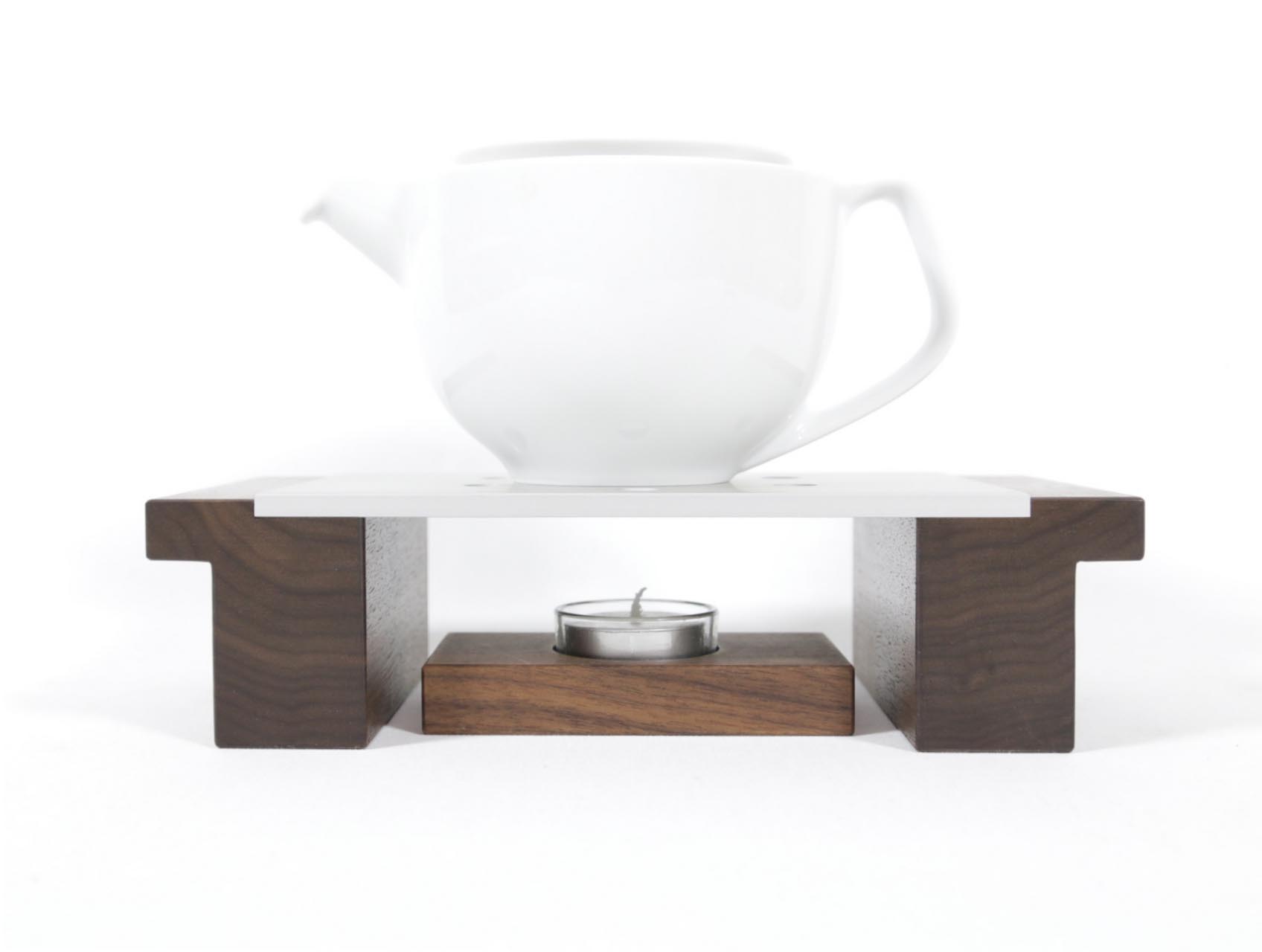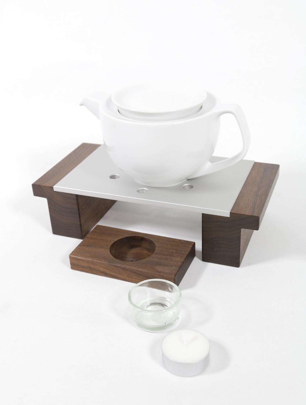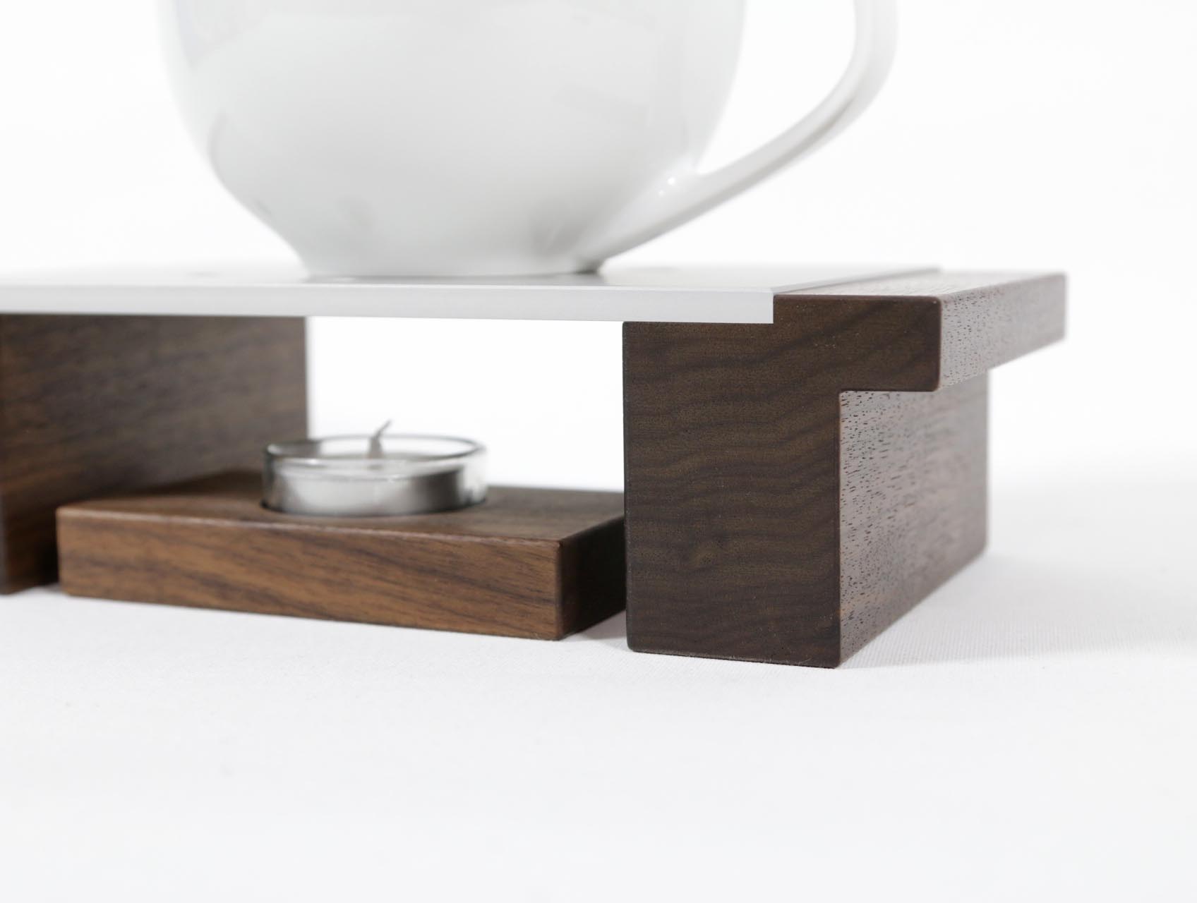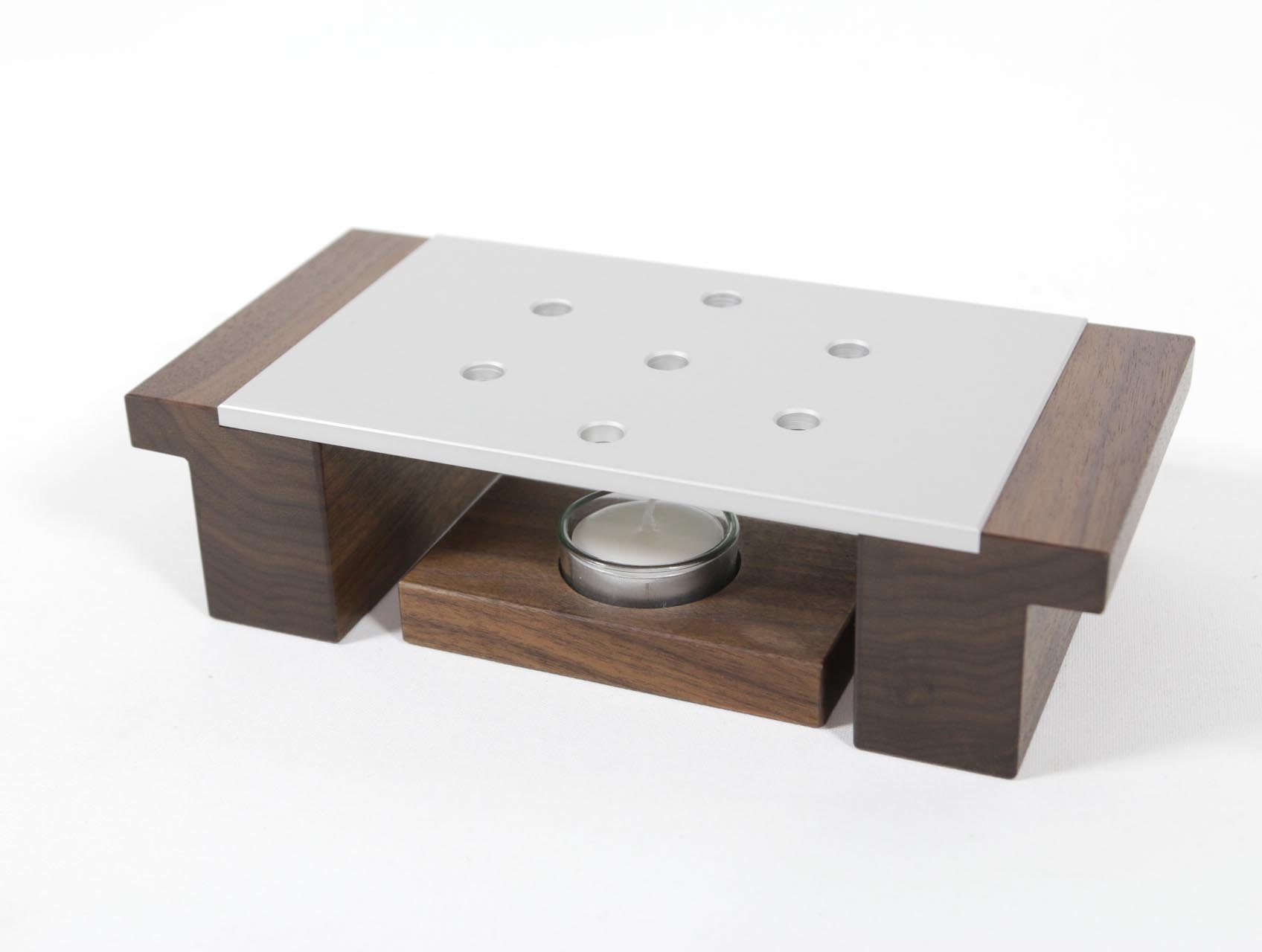 Edles Stövchen aus geöltem, heimischen Schwarznussholz und einer eloxierten Aluminiumplatte. Der Halter für ein Teelicht lässt sich zum Wechseln der Lichter einfach vorschieben.Das Stövchen steht absolut stabil, nichts kippelt.Die Aluminiumplatte leitet Hitze sehr gut und wird schön heiss. Sie hat etwas mehr Höhe als die beidseitigen Holzelemente, damit Töpfe und Ähnliches auf der Platte stehen und nicht auf dem Holz.