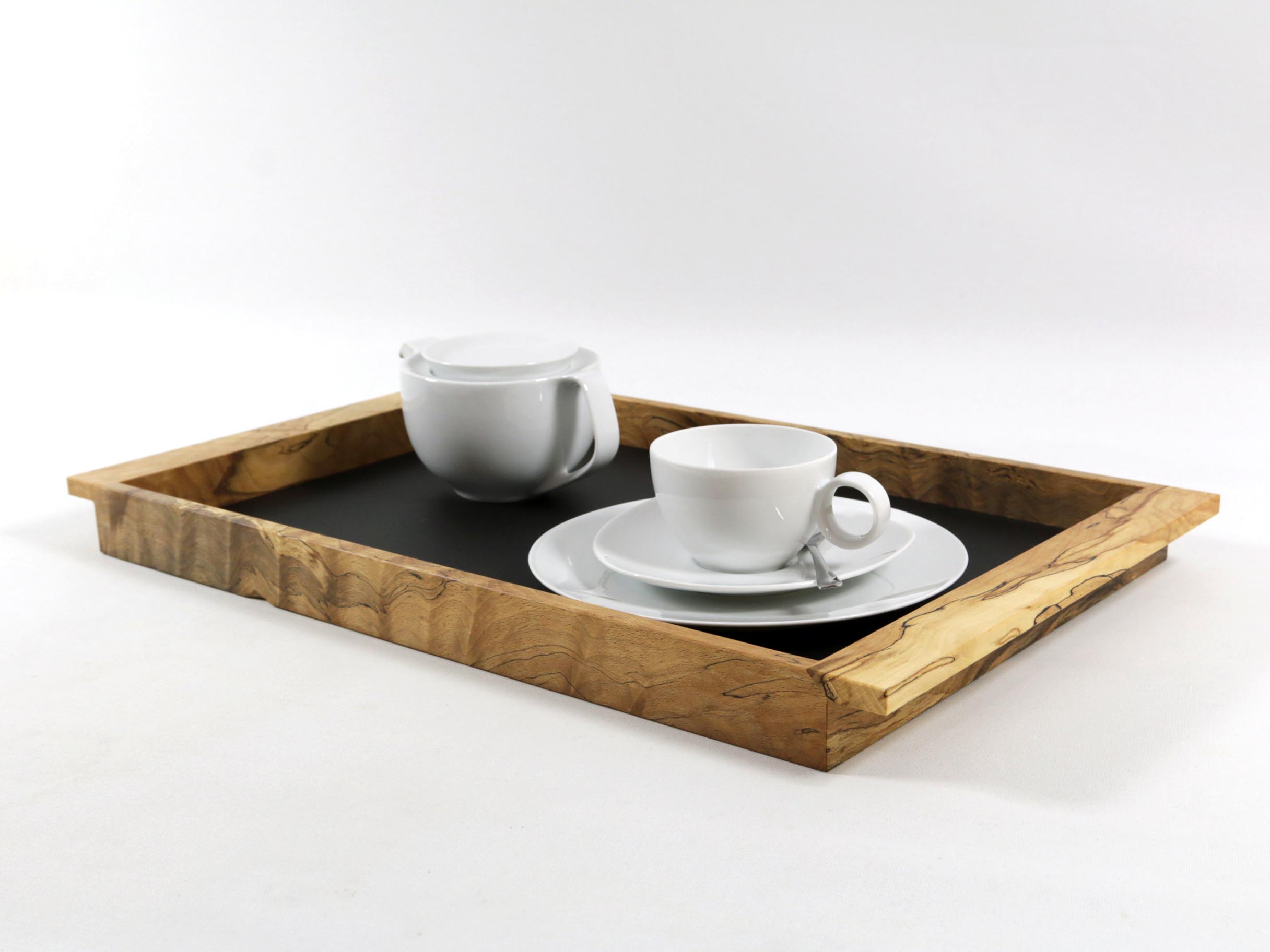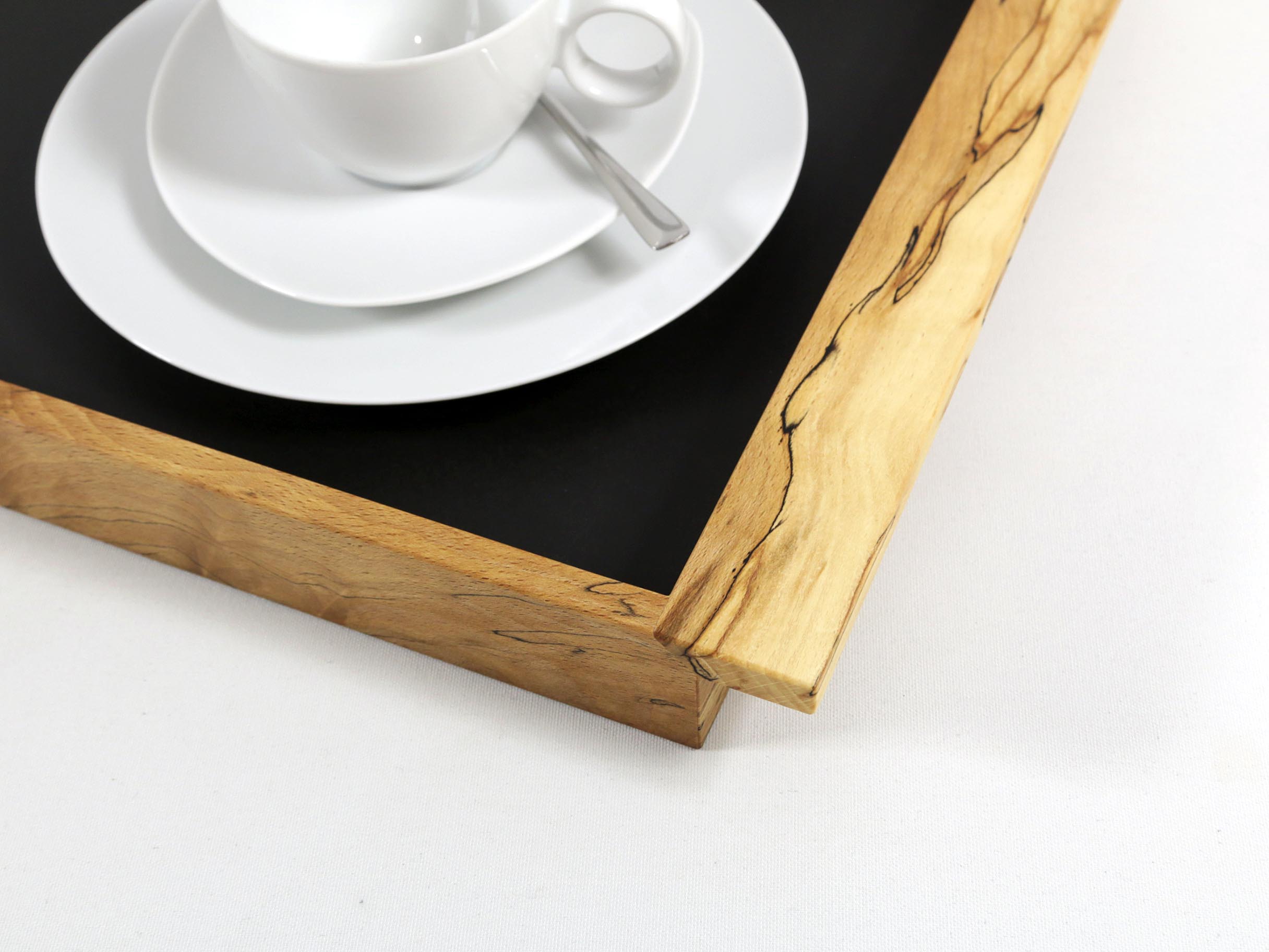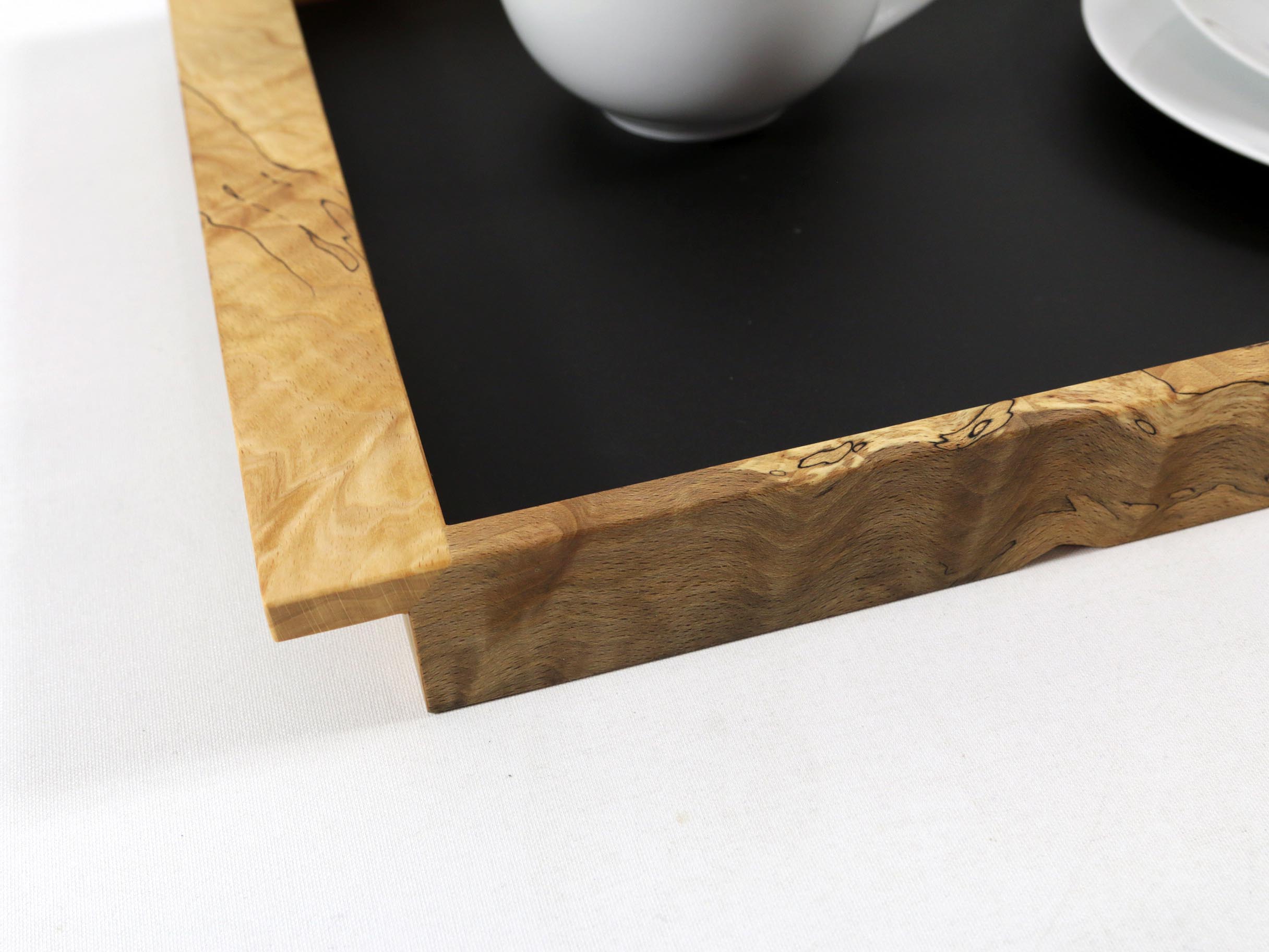 Großes, rechteckiges Tablett aus besonders wild gemasertem heimischen Buchenholz und schwarzem Linoleum