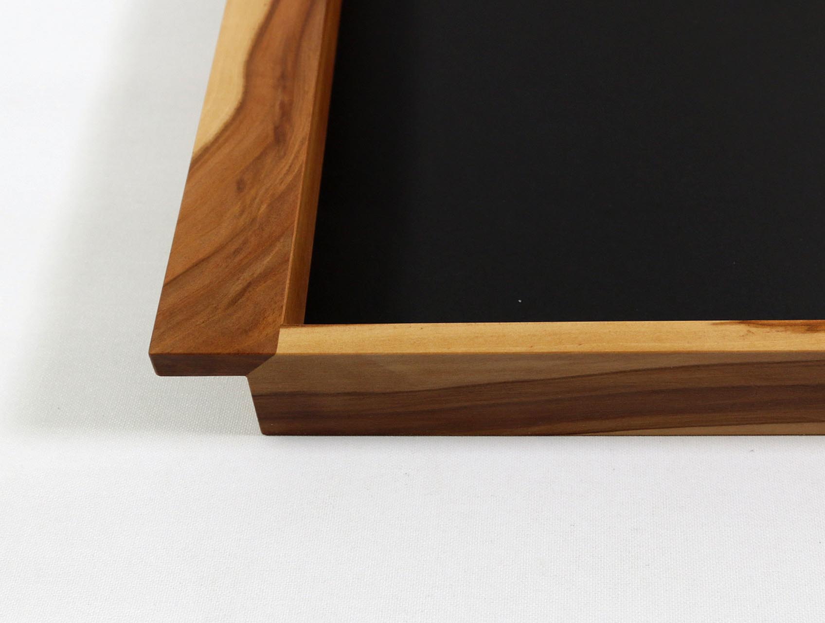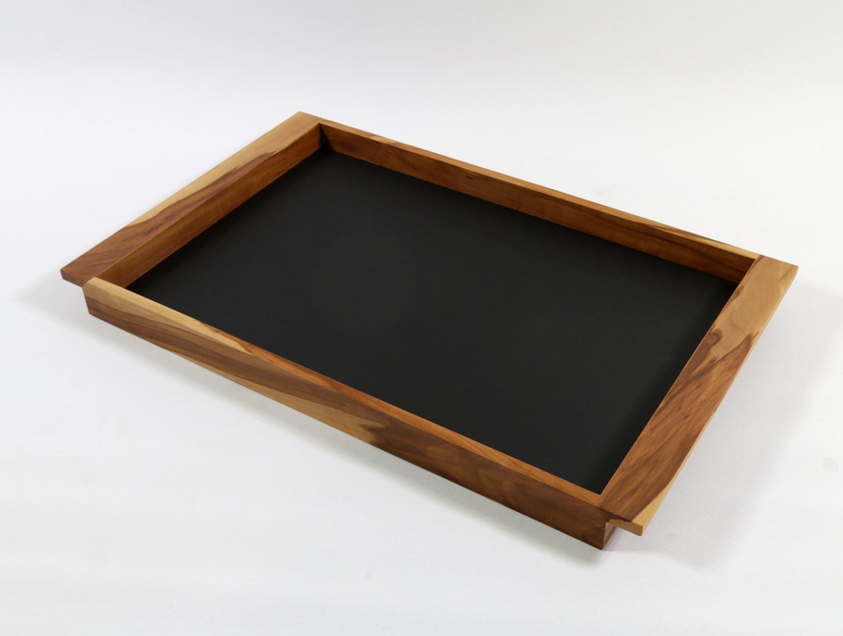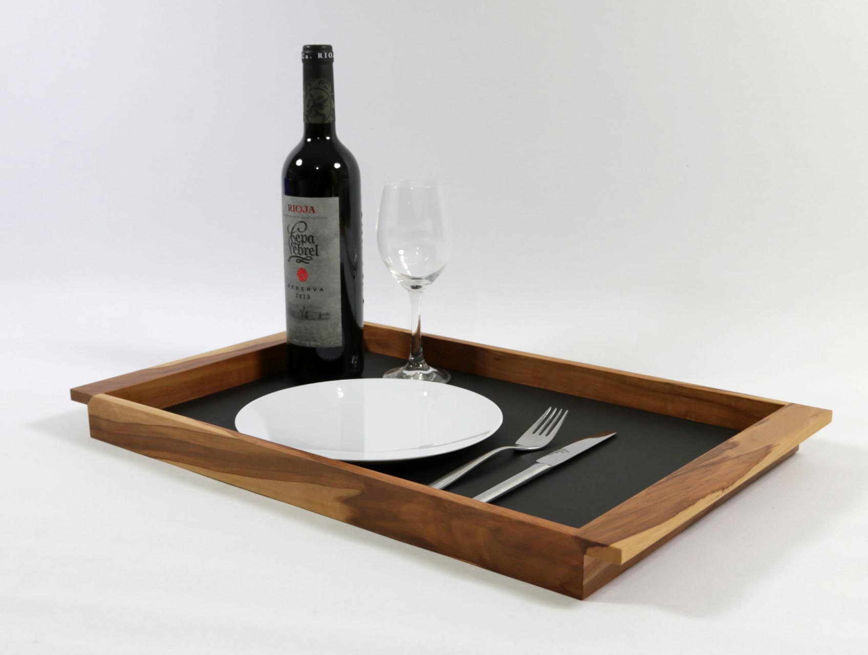 Großes, rechteckiges Tablett aus heimischem Apfelholz und schwarzem Linoleum in edlem, zeitlosen Design. Das Tablett ist schön leicht und mit seinen Griffen angenehm zu tragen. Durch das abwaschbare Linoleum ist das Tablett einfach zu Reinigen und zu Pflegen. Auch heiße Tee- oder Kaffeekannen können schadlos auf dem Linoleum-Boden abgestellt werden. Linoleum ist im Vergleich zu Holz außerdem deutlich rutschhemmender. Die Holzoberflächen sind feinst geschliffen, geölt und gewachst. Trotz seiner Leichtigkeit ist das Tablett äußerst stabil gebaut und in der Lage auch schwere Lasten problemlos zu bewältigen. Das Tablett lässt sich aufrecht stehend lagern und nimmt so wenig Platz weg.