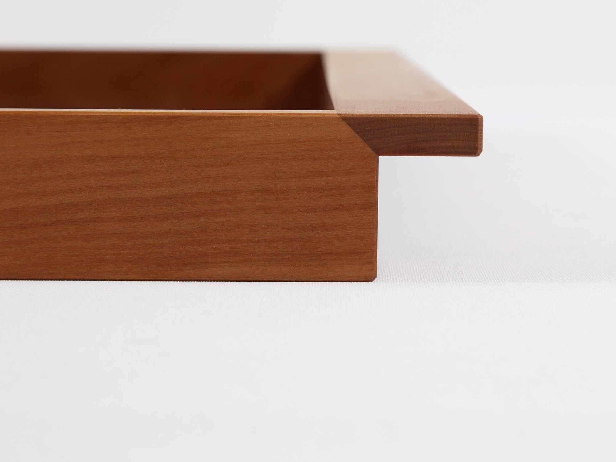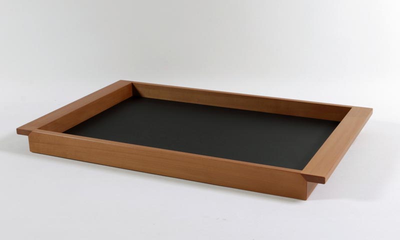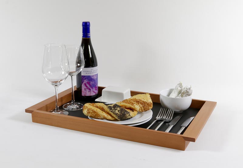 Großes, rechteckiges Tablett aus heimischem gedämpften Elsbeerenholz und schwarzem Linoleum in edlem, zeitlosen Design. Gedämpftes Elsbeerenholz hat einen warmen, rötlichen Ton. Die Maserung ist ruhig und zurückhaltend. Das Tablett ist schön leicht und mit seinen Griffen angenehm zu tragen. Durch das abwaschbare Linoleum ist das Tablett einfach zu Reinigen und zu Pflegen. Auch heiße Tee- oder Kaffeekannen können schadlos auf dem Linoleum-Boden abgestellt werden. Linoleum ist im Vergleich zu Holz außerdem deutlich rutschhemmender. Die Holzoberflächen sind feinst geschliffen, geölt und gewachst. Trotz seiner Leichtigkeit ist das Tablett äußerst stabil gebaut und in der Lage auch schwere Lasten problemlos zu bewältigen. Das Tablett lässt sich aufrecht stehend lagern und nimmt so wenig Platz weg.